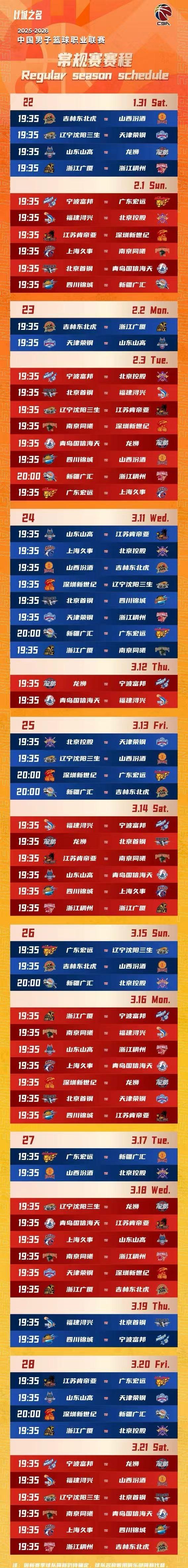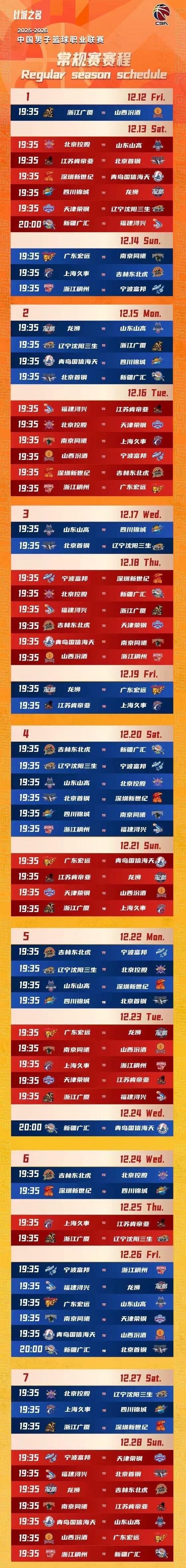 北京时间10月20日,CBA官宣2025-26赛季的常规赛赛程,合计42轮比赛,从2025年12月12日到2026年4月24日结束。CBA揭幕战是12月12日19:35,卫冕冠军广厦对阵山西的焦点比赛,也是上赛季常规赛前二的球队对决。