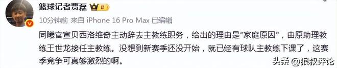 篮球记者贾磊发文点评:“没想到新赛季还没开始,就已经有球队主教练下课了,这赛季竞争可真够激烈的啊。 ”