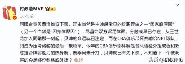 媒体人付政浩发文点评:“同曦官宣贝西洛维奇下课,理由当然是主帅最常见的辞职理由之一“因家庭原因”(另一个当然是“因身体原因”),尽量给双方留足体面。分歧或早已存在,从王世龙加入同曦那一刻起,贝帅的命运就已注定,而在CBA俱乐部杯赛输给NBL球队,则成为压垮骆驼的最后一根稻草。今年的CBA俱乐部杯赛是各队检验外援成色和教练捏合阵容能力的热身赛,赛季尚未开打,贝帅就已率先下课,不知道下一个被调整的会是哪位教练或外援?”