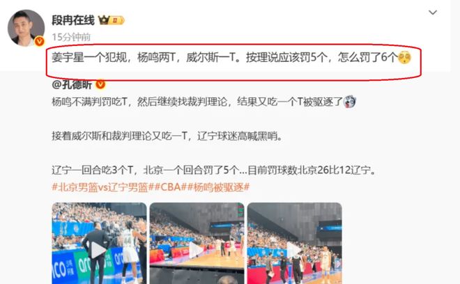 然而,辽宁队主教练杨鸣,对裁判的这次吹罚十分不满意,不断抱怨裁判!甚至,喷出了垃圾话,裁判在忍无可忍的情况下,吹了杨鸣一个技术犯规。但是,吃到技术犯规的时候,杨鸣依然没有停止,继续喷裁判,还一度摸了99号裁判的屁股……看到杨鸣这一系列的行为,99号裁判也是怒火中烧,再给杨鸣一个技术犯规,直接将他驱逐出场,就这样杨鸣喋喋不休地离开了赛场。随后,辽宁队外援威尔斯,也是吃到了一个技术犯规,因为,他也是在不断抱怨裁判。就这样,辽宁队吃到了三个技术犯规。结果,陈盈骏获得了5次罚球的机会,2个犯规罚球+3个技术犯规罚球!