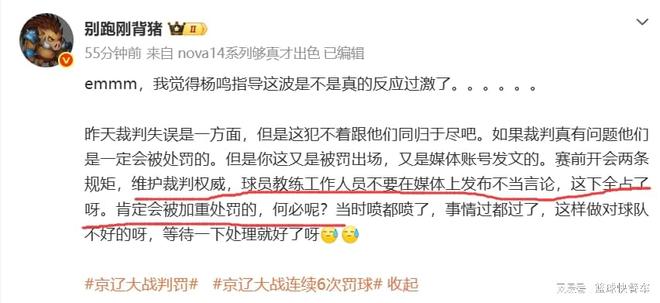 先说说辽宁队与北京队这一场比赛吧。其实两队算是势均力敌,双方前三节比赛,两队比分交替领先。不过,在进入到第四节比赛以后,北京队突然发力,将分差拉开到6分。不过,此时比赛还剩下6分多钟,辽宁队其实也有足够的时间逆转。然而,戏剧性的一幕发生了。姜宇星在拼抢时肘击到了陈盈俊,后者随即倒地,此时裁判也及时响哨。从后来的慢镜头回放来看,裁判的吹罚其实没有问题。不过,作为主教练,杨鸣对于这一次吹罚,却是极为不满意。他直接上前找裁判理论,而裁判对于杨鸣的喋喋不休也非常不满意,随即给了杨鸣一个T。正常情况下,在获得一个技术犯规后,杨鸣大概率会冷静下来。可这一次,杨鸣却选择硬刚裁判,而当值裁判也不是好惹的,他随即又给了杨鸣一个T,直接将他当场驱逐。随后威尔斯又疑似爆粗口,又再度领到一个T。短短一个回合,辽宁队便获得3个T,送北京队6次罚球机会(正常应该是5次)。而在辽宁队输给北京队后,杨鸣对于裁判这一次吹罚,还是极为不满。尽管双方比赛已经结束了,不过,杨鸣还是再次选择硬刚裁判。在个人社媒上分享了一段话:“你必须学会回击每一个不会尊重你的人,遭遇欺压时,不必害怕将事态扩大,对方的筹码正是赌你会沉默,沉默换不来理解,只能换来得寸进尺…………”很显然,杨鸣这一段是在回击裁判的争议性吹罚。不过,值得一提的是,杨鸣此番言论,大概率会遭到篮协和CBA的重罚。要知道,在CBA开始前,篮协还一再强调了,CBA球员和主教练,不得不在公开场合以及社媒上发布不当言论。并且,篮协和CBA已经强调了,他们为进一步维护裁判权威。这也就意味着,一旦裁判吹罚具有争议性,篮协和CBA会针对性处理。但作为球员和教练员,如果公开指责裁判的话,肯定会遭到处罚。考虑CBA新赛季才开始,为了起到杀鸡儆猴的效果,篮协和CBA最终可能会选择杀一儆百,对于辽宁队和杨鸣进行重罚。毕竟,在CBA开始前,他们已经一再强调了,对于此类事件采取零容忍态度。如果真的如此的话,那么,杨鸣和辽宁队确实是得不偿失。辽宁队已经输给了北京队,杨鸣也连吃2T了。现如今,因为赛后在社媒上的不文明言论,杨鸣或将再次遭到重罚,辽宁队确实是输麻了。