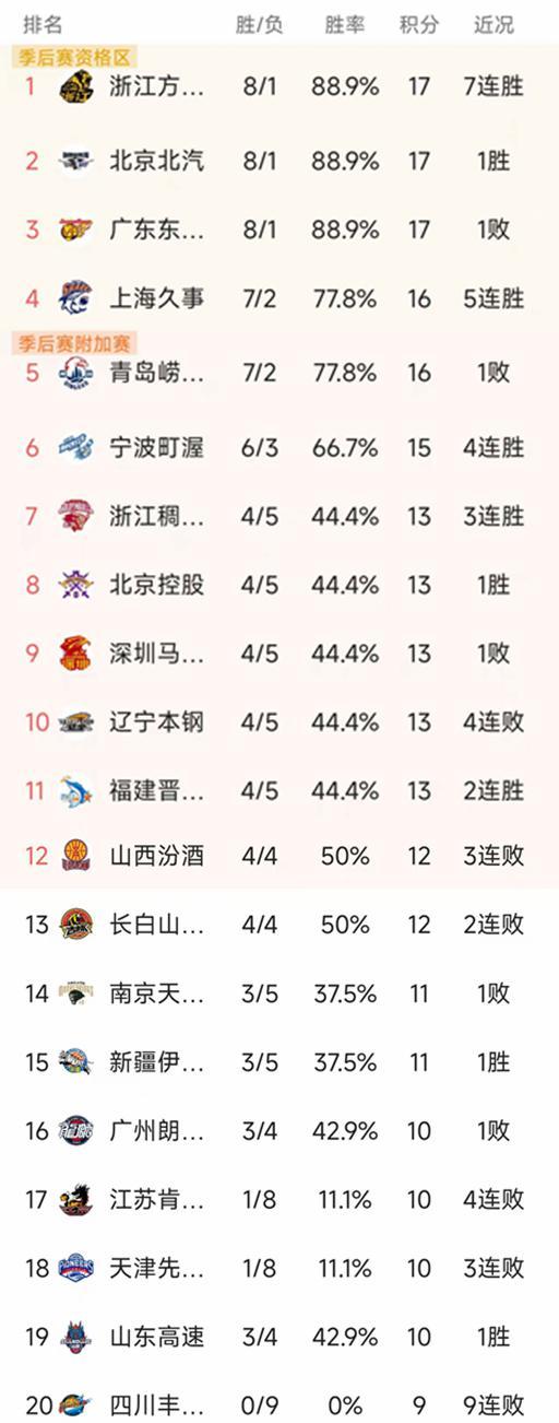 南京和新疆都是3胜5负暂列第14-15,广州3胜4负暂列第16名,江苏、天津都是1胜8负,他们没有任何的竞争力。山东由于只打了7场比赛,3胜4负积10分排名稍微靠后,四川是唯一没有胜场的球队,遭遇9连败垫底!
