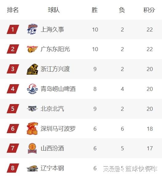 积分榜第6名则属于深圳队,他们这一场比赛客场输给了实力强大的广东队,这一战过后,他们的战绩变成6胜6负,胜率刚好过半,暂时排在积分榜第6名。而山西队则紧随其后,以6胜5负的战绩,排在积分榜第7名。积分榜第八名则属于四冠王辽宁队,他们在上一轮比赛结束四连败,目前的战绩是6胜5负,暂时排在积分榜第8名。而积分榜第9名则是宁波队。第10名则是广州队,他们的战绩是6胜4负。