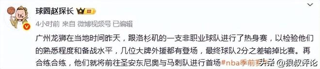 北京时间10月4日,根据媒体人赵探长的报道,广州龙狮在当地时间昨天跟洛杉矶当地的一支球队进行了热身赛,以检验他们的熟悉程度和备战水平,几位大牌外援都有登场,最终球队2分惜败。再合练合练,他们就将前往圣安东尼奥与马刺队进行首场NBA季前赛。