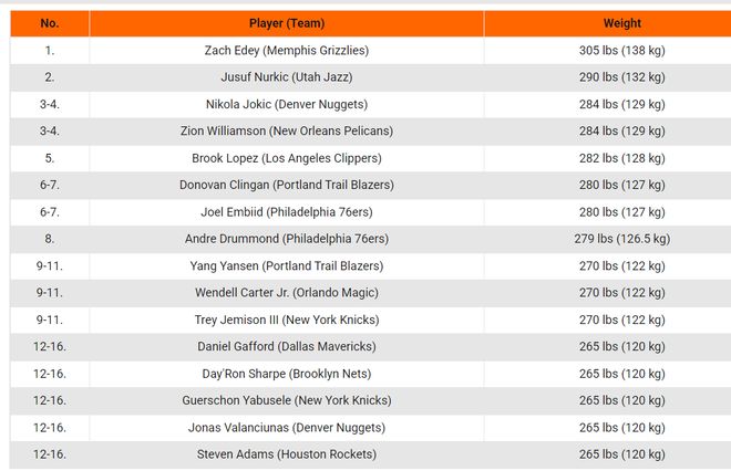 北京时间10月12日,外媒Basketnews列出了本赛季NBA球员体重榜单,华裔中锋扎克·埃迪排名第一,杨瀚森位居第九。减重的锡安排名第三,同样减重的东契奇则是跌出了前十。这份榜单如下:1.扎克·埃迪以305磅(约138公斤);2.努尔基奇 290磅(约132公斤);3.约基奇284磅(约129公斤)、锡安284磅(约129公斤);5.布鲁克·洛佩斯282磅(约128公斤);6.克林根280磅(约127公斤)、恩比德280磅(约127公斤);8.德拉蒙德279磅(约126.6公斤);9.杨瀚森 270磅(约122公斤)、小温德尔·卡特270磅(约122公斤)、特雷·杰米森270磅(约122公斤);12.加福德265磅(约120公斤)、戴隆·夏普265磅(约120公斤)、亚布塞莱265磅(约120公斤)、瓦兰丘纳斯265磅(约120公斤)、史蒂文·亚当斯265磅(约120公斤)。身高2米24的埃迪成为全联盟体重最大的球员,达到了138公斤。作为一位华裔中锋,他在2024年选秀大会第9顺位被灰熊选中。上赛季在灰熊成为首发中锋,场均得到9.2分8.3篮板1.0助攻1.3盖帽,投篮命中率58.0%,三分命中率34.6%,罚球命中率70.9%。埃迪和克林根都是杨瀚森的参照对象。克林根体重127公斤并列排名第六,和恩比德一样重。在NBA联合试训营的体测中,杨瀚森的各项数据和埃迪以及克林根比较相似。埃迪和克林根都在NBA站稳脚跟,让很多人对杨瀚森也充满信心,只不过杨瀚森需要花一些时间适应NBA节奏,适应语言关。杨瀚森展现了不错的适应能力。值得一提的是,他在休赛期增加了一些体重,提升自己的对抗。对于杨瀚森来说,增重是一门科学,不能过度增重,否则膝盖和双脚的负荷会过大。所幸,杨瀚森基本上属于地板流打法的中锋,没有那么多直上直下的蹦跳,可以更好地避免受伤。减重的锡安依然有129公斤的体重,而他体重最高时达到了150公斤,也就是达到了300斤。锡安在休赛期的减重效果还是不错的。东契奇则是跌出了前十榜单。他的体重减到了230磅,大约104.3公斤,而东契奇的体重最高是‌270磅(约122公斤)。