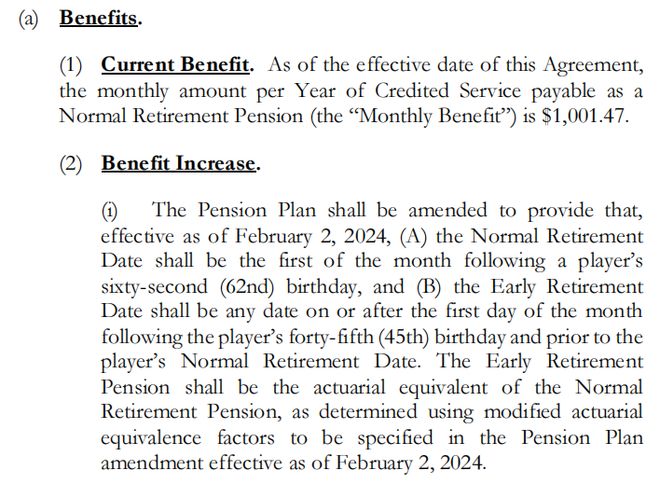 NBA退休金相关规定。 NBA2023版劳资协议截图 NBA退役球员协会前总裁兼首席执行官斯科特·罗谢尔曾表示,退役球员可以选择最早在45岁开始领取养老金,但是这样的话,由于他们领养老金的时间会大大拉长,因此他们能够领到的总数额就将有所削减。“联盟鼓励球员们在62岁开始领养老金,这样他们领到的金额将大大增多。” 姚明1980年9月出生,刚满45岁,且在NBA效力了9年,因此已经满足NBA退休金的领取条件。若姚明选择从62岁开始领取全额退休金,则每月可领取9913.23美元(约人民币7万元)。 本文系观察者网独家稿件,未经授权,不得转载。