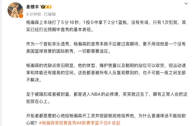 雷速体育10月23日讯 NBA常规赛,开拓者今日主场迎战森林狼。中国球员杨瀚森迎来了NBA生涯的常规赛首秀,上半场他出战5分钟,依靠罚球拿到2分。媒体人“麦穗丰”发文点评:杨瀚森上半场打了5分16秒,1投0中拿下2分1篮板,没有失误,只有1次犯规,其实已经打出预期中首秀的基本表现。作为一个首轮非乐透秀,杨瀚森的首秀本就不应被过高期待,更不用说他是一个没有美国篮球背景的国际新秀,一切都需要适应。杨瀚森的优缺点依旧明显,他的体型、掩护质量以及聪明的站位可以收货,但运动速率和体能还有提高的空间。这些都是被所有人反复观察到的,也不可能一夜之间全部不解决。至于被隔扣或者被封盖,都是进入NBA的必修课,笑笑就过去了,哪有正常人会把这些放在心上。开拓者都愿意耐心地给杨瀚森开工资并按部就班地培养他,为什么普通球迷不能给耐心呢?