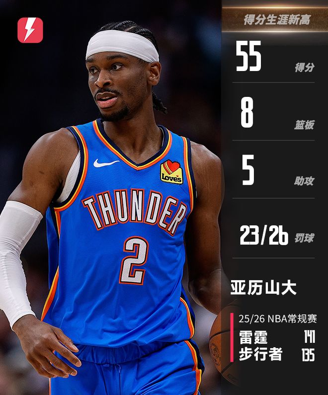 雷速体育10月24日讯 今日NBA常规赛,雷霆对战步行者。比赛鏖战双加时,最终雷霆取胜。本场比赛,雷霆当家球星亚历山大出战45分钟,罚球26罚23中。爆砍55分8篮板5助攻,带领雷霆双加时险胜步行者!值得一提的是,本场不仅是NBA本赛季的第一个50+,也是亚历山大生涯得分新高!