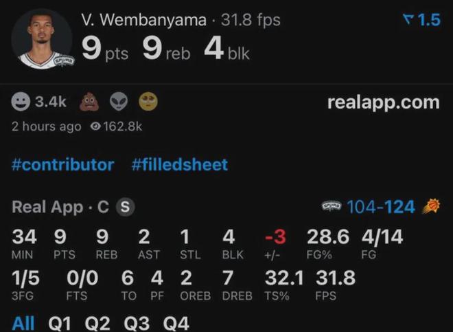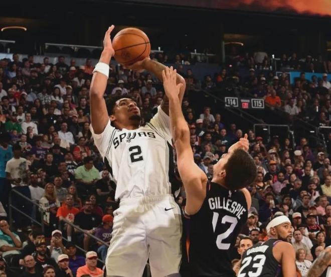 一直打到第四节还剩10分钟,文班亚马才迎来了自己的第二个运动战得分,他在篮下抓住一个错位的机会,上篮命中。但此时马刺大势已去,他们以118比130输给了太阳,算是给西部第11的弱队送温暖了。