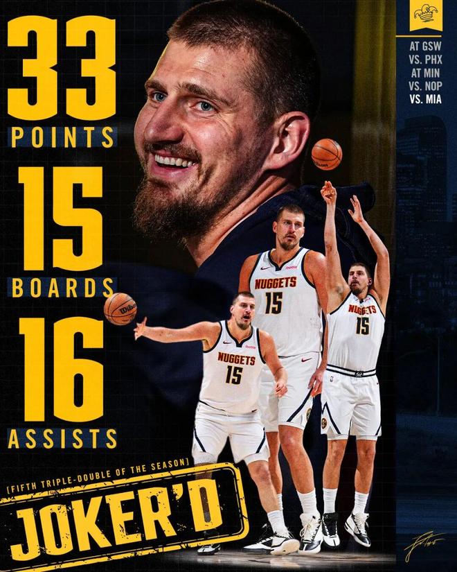但,随着赛季开始慢慢深入,约基奇终于开始发力了。上一场比赛,掘金主场122-112力克热火,约基奇交出了赛季至今个人最好的表现:全场出战36分钟,投篮18中12,三分5中2,罚球8中7,得到33分15篮板16助攻3抢断。需要说的是,约基奇三节结束的时候就已经达到了28分12篮板13助攻三双,全场下来,他的正负值高达全队第一的+18,换言之,约基奇不在场,掘金反而净负热火8分。