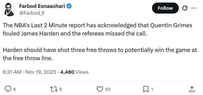 值得一提的是,裁判并不是仅漏判这一次,最后2分钟除了这一次三分绝杀被打手漏判之外,裁判还先后漏吹了祖巴茨与庄神的防守三秒犯规,这意味着,最后2分钟时间里,快船队2度吃亏。快船队记Farbod Esnaashari吐槽道:“哈登本应获得三次罚球机会,并且有机会通过罚球完成绝杀。”