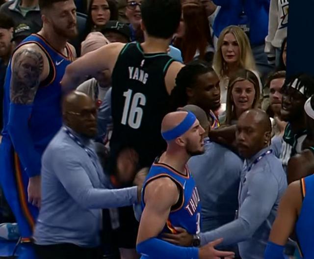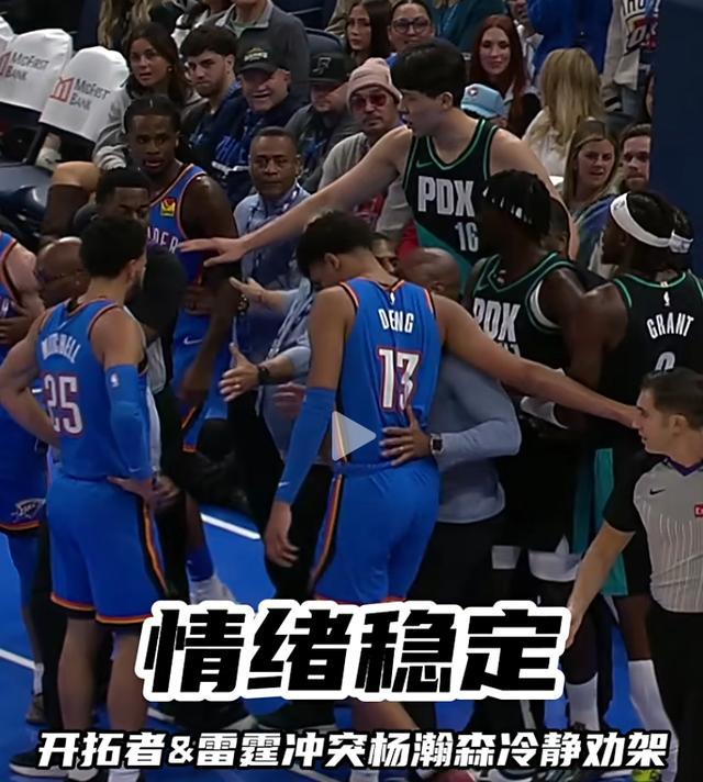 杨瀚森也在同场比赛充当“和事佬”,迎来NBA生涯首次劝架。当时吕佩尔对米切尔犯规引发冲突,哈尔滕施泰因情绪激动,杨瀚森从身后将其拉走,冷静化解事态。赛事详情>>据体坛周报消息,北京时间今天(24日),NBA常规赛继续进行,雷霆主场迎战开拓者,杨瀚森本场比赛替补待命。雷霆近期豪取8连胜状态正佳,开拓者则刚刚力克勇士结束4连败,本场比赛,雷霆还是展现出更高一筹的实力和状态,比赛也早早进入垃圾时间,最终雷霆122比95大胜开拓者。首节比赛,雷霆开局就状态火热,送上18比8建立起领先优势,他们在这一节共砍下39分,同时只让开拓者得到18分,可以说首节就奠定了巨大的领先优势。杨瀚森在第一节末段得到上场机会,并在第二节一开始送上助攻,还命中了NBA生涯首个三分。开拓者在第二节虽然能够和雷霆周旋,但是首节挖下的大坑始终无法填上。半场结束时,开拓者落后21分。第三节,雷霆稳扎稳打,开拓者则依然办法不多,雷霆再次单节净胜7分,分差也来到29分之多,比赛悬念逐渐丧失。末节,杨瀚森再次上场,2+1打成并空接暴扣得手,不过开拓者落后太多无力回天,最终,雷霆122比95大胜开拓者,取得9连胜。全场比赛,亚历山大37分5篮板7助攻2抢断,米切尔20分1篮板5助攻2抢断,乔10分2篮板1助攻,吉昂8分3篮板1助攻,卡尔森8分1篮板2助攻,哈尔滕施泰因7分15篮板3助攻3盖帽,华莱士7分2篮板1助攻2抢断,霍姆格伦5分9篮板4助攻3盖帽,巴恩海泽5分3篮板1助攻,多特5分3篮板,杰林·威廉姆斯5分2篮板4助攻,卡鲁索5分2篮板2助攻,扬布拉德2篮板2助攻。开拓者方面,杨瀚森出场17分36秒,投篮11中3,三分6中1,罚球1中1,贡献8分4篮板3助攻1抢断1盖帽。其他开拓者球员中,格兰特21分3篮板2助攻,阿夫迪亚11分5篮板1助攻,吕佩尔10分5篮板,穆雷9分7篮板,克林根8分8篮板2助攻2盖帽,乐福8分2篮板2助攻,西索科7分2篮板3助攻,里斯6分3篮板2抢断,卡马拉4分6篮板3助攻2抢断,库克3分。来源:九派新闻综合钱江视频、体坛周报等